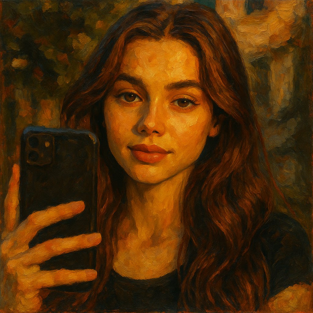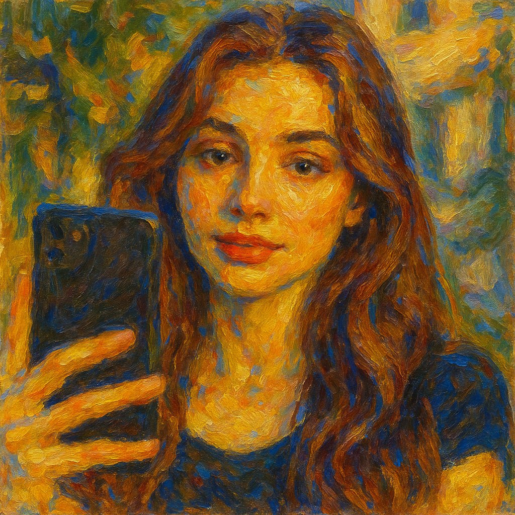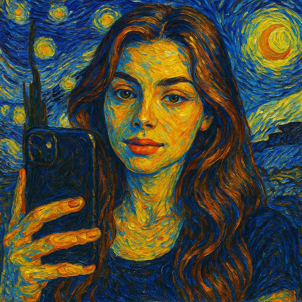 Перерисуй моё фото в стиле Van Gogh, используя мазки кисти и насыщенные цвета. Фон должен напоминать «Звёздную ночь».