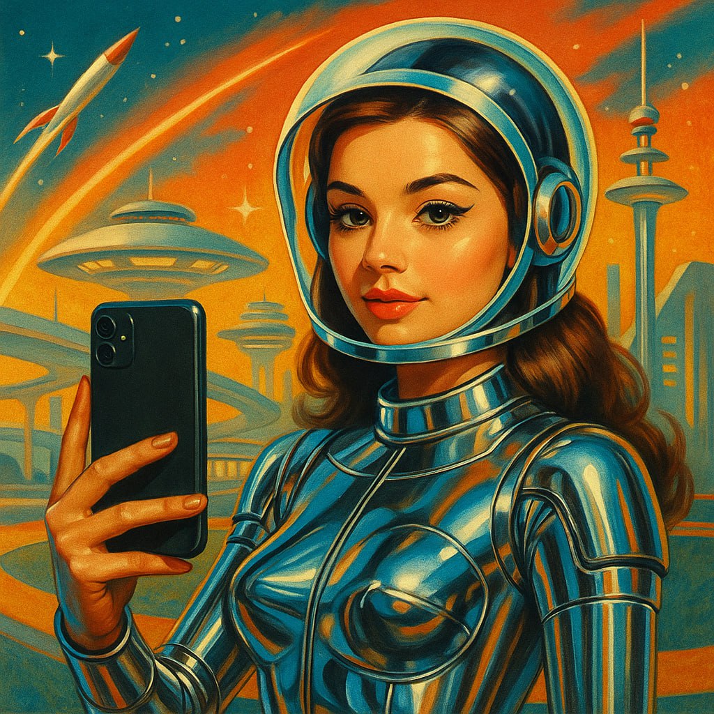 Превратите этот образ в ретро-футуризм с использованием научной фантастики 60-х/ 70-х годов, хромированных деталей и оптимистичных технологий