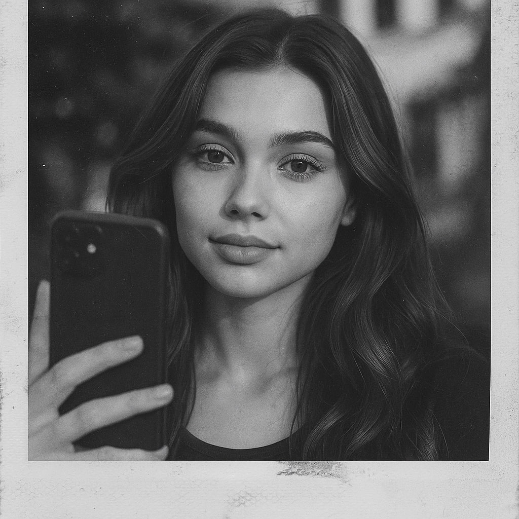 Визуализируйте это изображение как черно-белую фотографию Polaroid, с зернистостью пленки и винтажным выцветанием