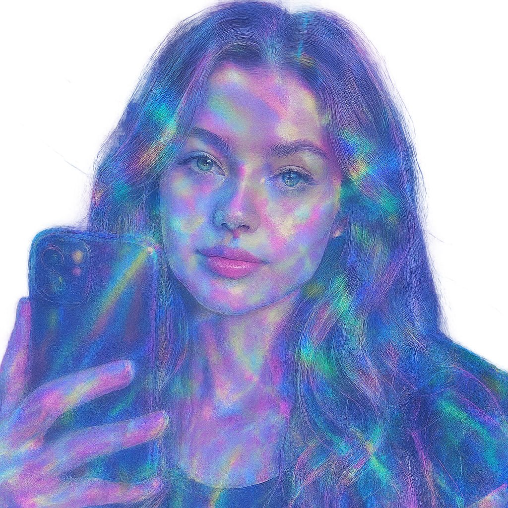 Перерисуй это изображение в стиле Hologram Portrait и сохрани все ключевые детали, добавь прозрачность, радужные блики и футуристический блеск.