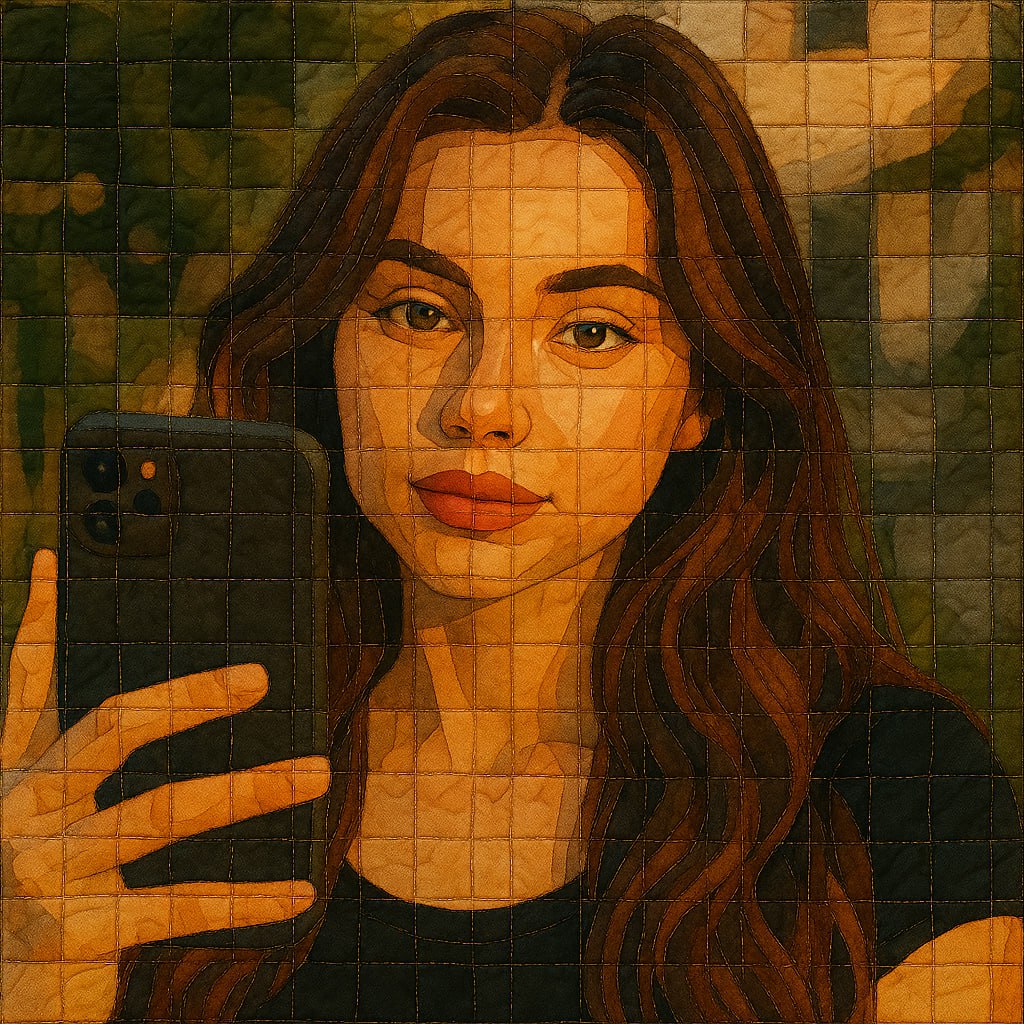 Превратите это изображение в лоскутное одеяло с квадратами из ткани и видимыми стежками