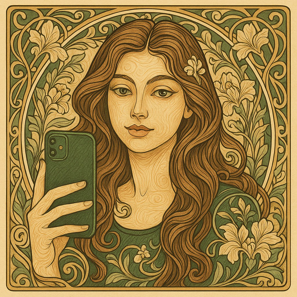 Преобразите этот образ в стиле ар-нуво, используя плавные линии, витиеватые цветочные мотивы и декоративные рамки