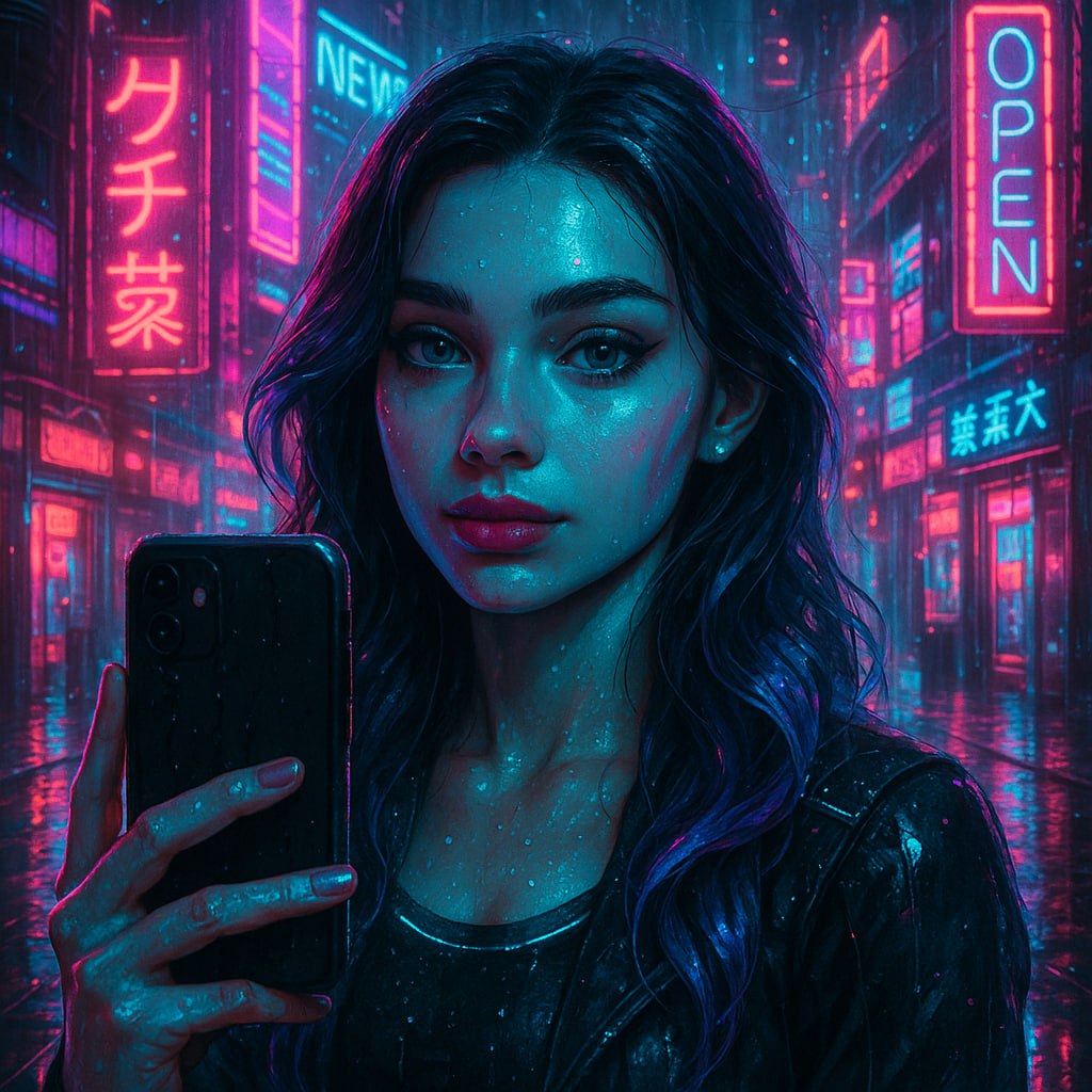 Измените стиль этого изображения в стиле киберпанк, наполните его мокрыми от дождя улицами, неоновыми вывесками и футуристической энергией