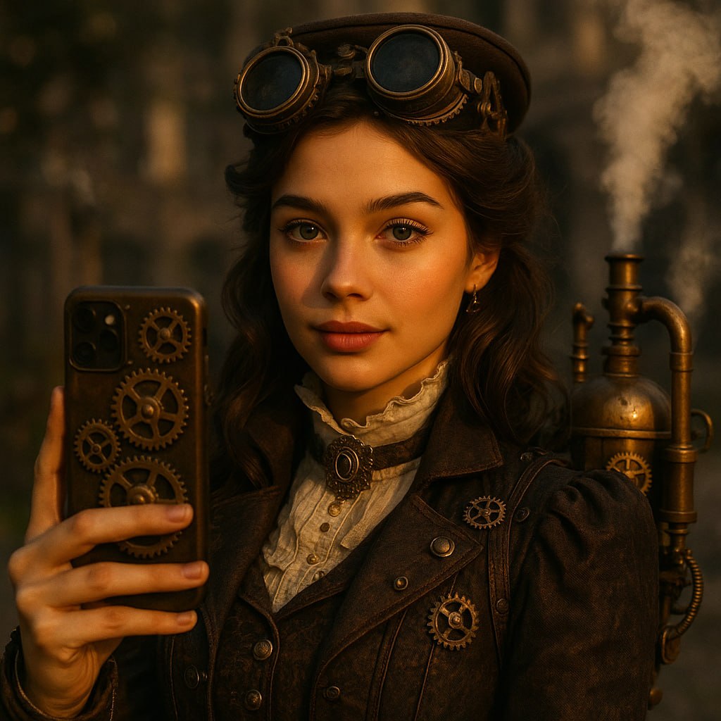 Превратите этот образ в стиль стимпанк с помощью латунных шестеренок, викторианской моды и устройств, работающих на пару