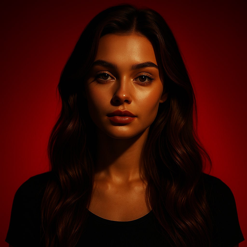 Освещение драматичное и кинематографичное, подчеркивающее структуру лица и создающее атмосферу роскошного модного журнала. Ультрареалистичный, высокодетализированный стиль редакционной фотографии. Симметричная композиция, минимум элементов фона.