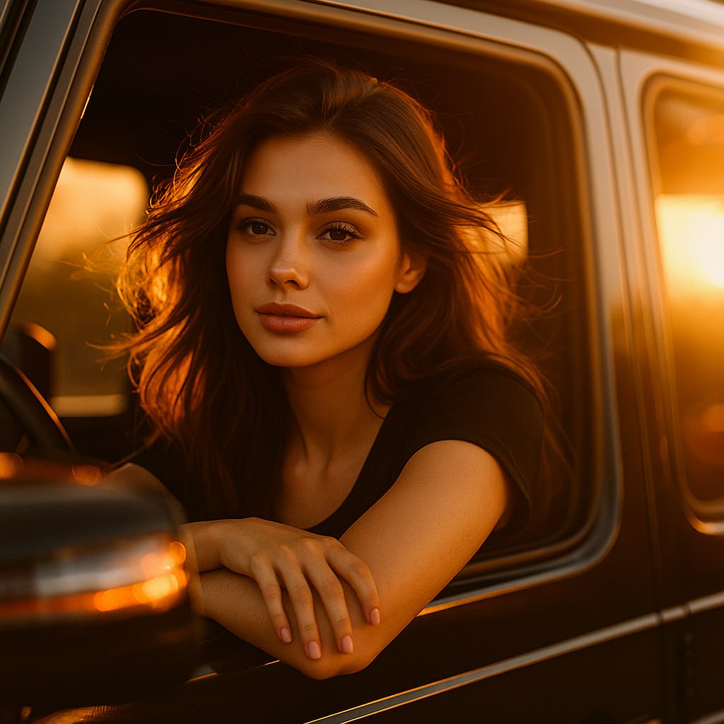 Теплый солнечный свет заливает салон автомобиля, создавая оранжевые блики и мягкие тени на лице.